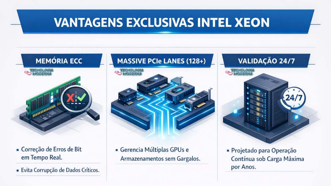 Em servidores e data centers, um travamento de sistema pode custar milhões. Por isso, os processadores Xeon são projetados com tolerância a falhas em mente. Eles trazem recursos exclusivos que o mercado doméstico geralmente ignora.